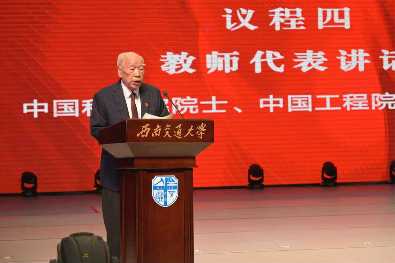 教师代表沈志云院士回顾了学校与国家发展共同奋进的历程,解读学校在峨眉办学时期人才培养硕果累累的三大原因:一是历史久、底蕴深,学校作为中国第一所工程教育高等学府,一直引领中国轨道交通事业;二是思维新、视野宽,始终追踪世界铁路发展趋势,不断创新探索;三是严谨治学、严格要求,注重“双严”传统的传承,始终坚持以人才培养质量为根本。沈志云院士希望交大人在更完备的条件支撑下,以创新思维、宽阔视野,继续引领中国乃至世界的轨道交通事业发展。