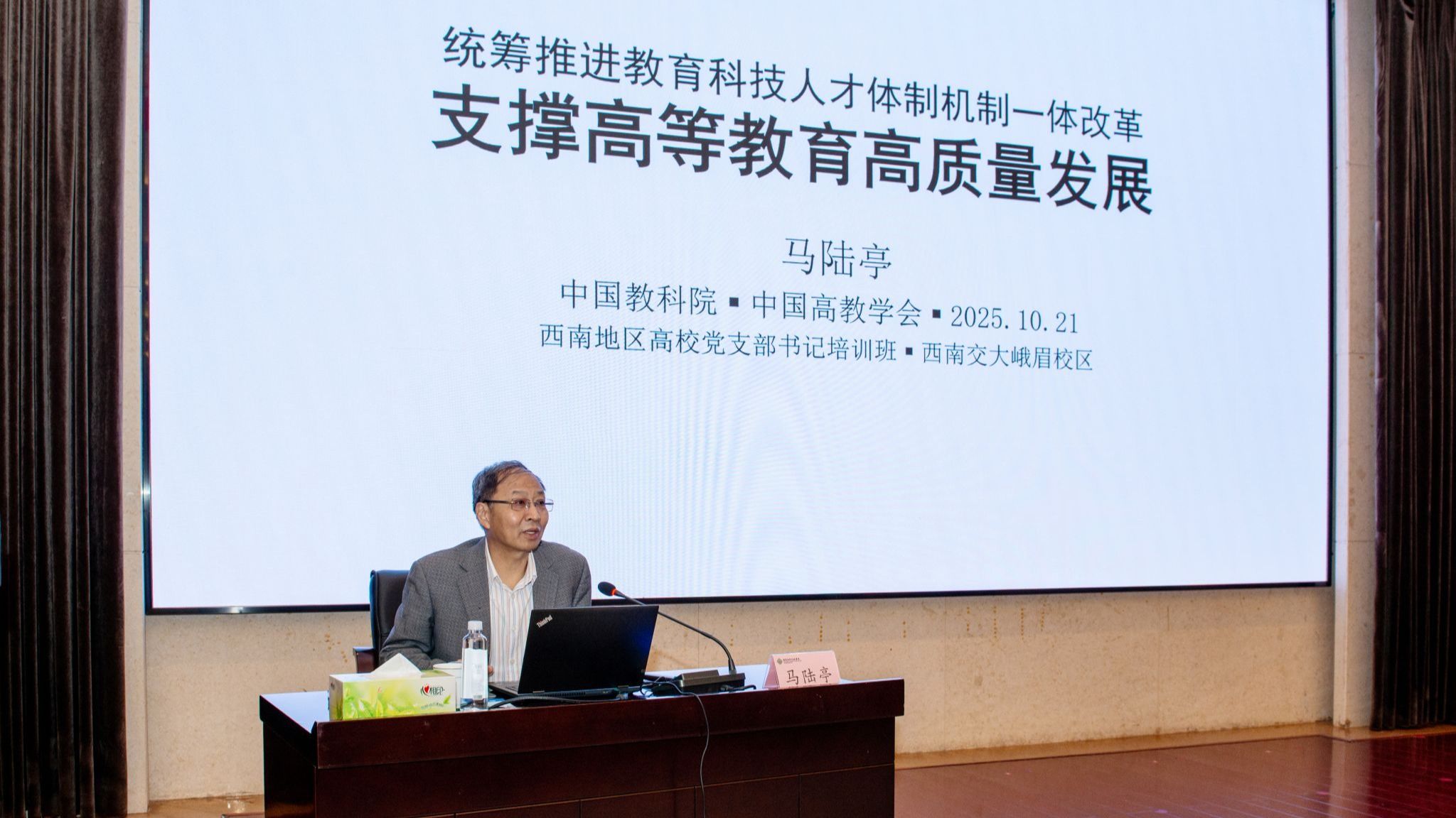 开班式结束后,中国高等教育学会学术发展咨询委员会副主任兼秘书长,中国教育科学研究院原副院长马陆亭研究员以“统筹推进教育科技人才体制机制一体改革,支撑高质量发展”为题,为培训班作首场专题报告。