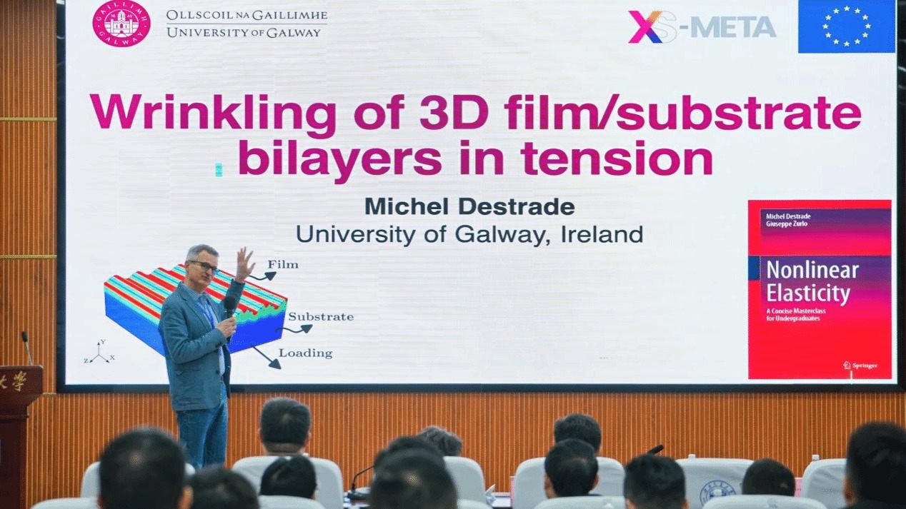 与会专家学者围绕力学领域前沿方向展开深入交流。燕山大学文桂林教授作了题为“倾转旋翼无人机设计思想与变构过程力学分析”的报告,爱尔兰高威大学Michel Destrade教授分享了薄膜/基底双层结构拉伸起皱失稳的相关研究。此外,天津大学王世斌教授、北京交通大学陈阿丽教授、华中科技大学彭泽瑞教授、best365英国在线体育陈开卷教授等分别就基础力学研究性教学、声学超表面波前调控、仿生柔性结构流固耦合动力学、拉胀结构逆向设计等课题作学术汇报。