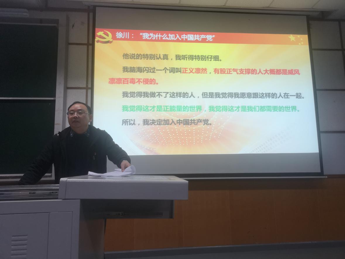党课伊始,一首嘹亮的“入党誓词歌”响起,在场的师生立刻被铿锵有力的歌声所感染。紧接着,杨德友同志切入主题,从“我为什么要入党”、“中国共产党伟大在何处”和“中国共产党因何而伟大”三个方面开始讲授。