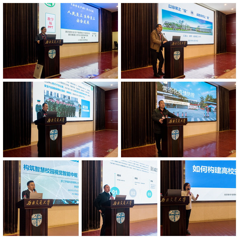 此次研讨会还邀请了四川省安全生产培训协会专家委员会主任委员、四川师范大学安全教育研究院隆泗教授作《安全生产法》学习交流;成都理工大学保卫处长滕梦以“以非常之役、战胜非常之疫”为主题的报告了成都理工大学疫情防控相关经验;相关成员单位介绍了“构筑智慧校园视觉智能中枢”技术和实施方案情况,以及“智慧安防”建设情况等。