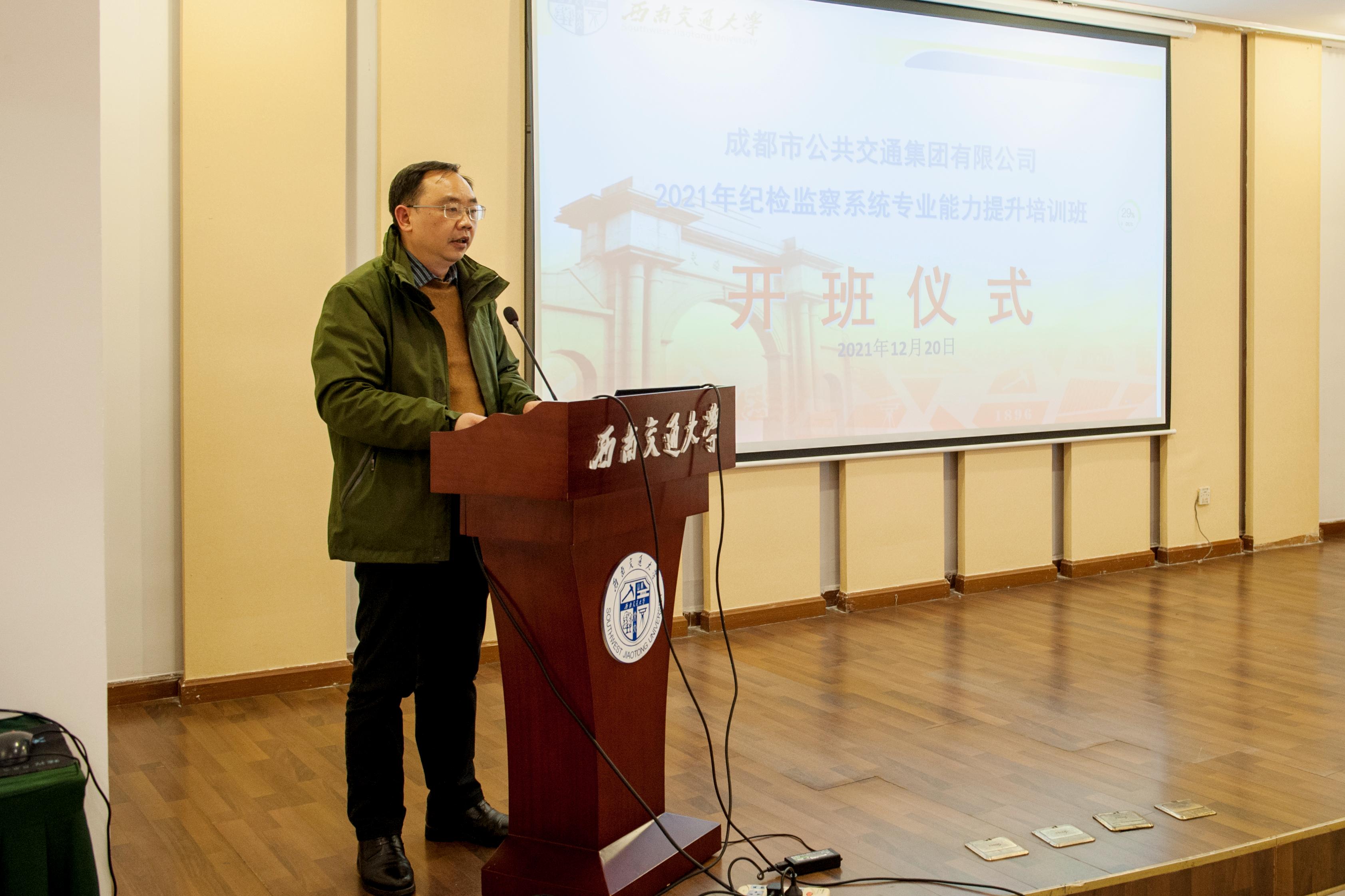 他指出,刚刚结束的党的十九届六中全会,对全面从严治党、党风廉政建设和反腐败斗争提出新的要求,今天举办的纪检监察系统专业能力提升班,就是为了深入学习贯彻党的十九届六中全会精神,深刻领悟“两个确立”的决定性意义,进一步提升纪检监察干部队伍的政治素质和业务素养。杨德友强调成都市公共交通集团与我校可谓是“志同道合”,“交通”二字,即“天地交而万物通”之意,它让我们两家结缘相识,期待双方有更多方面、更深层次的合作,实现更多互利共赢。