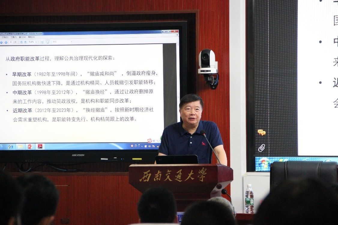 中国行政管理学会高小平研究员以“2023年机构改革对公共治理现代化的新探索”为主题,从法、术、势三个视角对我国机构改革的维度和影响进行了深度剖析。