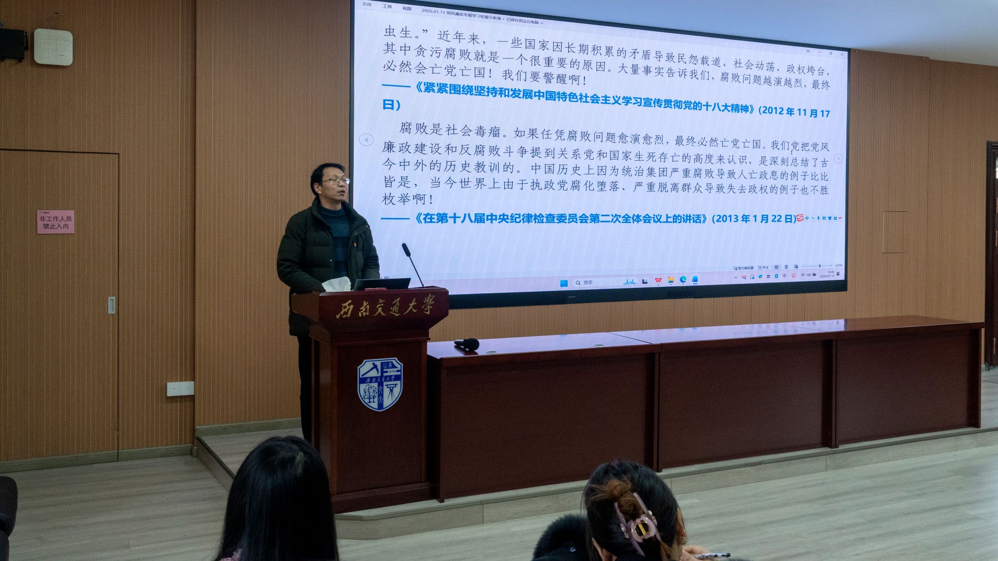 随后,校区纪委书记陈诗伟同志组织开展党风廉政建设专题学习及警示教育。与会人员共同学习《习近平总书记关于党风廉政建设和反腐败斗争论述摘编》,并传达贯彻了习近平在二十届中央纪委五次全会上发表的重要讲话精神。陈诗伟结合教育部公开通报的高校及教育系统相关典型案例进行剖析,以案释纪、以案明规,教育引导全体党员以案为鉴、自省自律,时刻绷紧纪律之弦,筑牢拒腐防变的思想防线和行为底线。