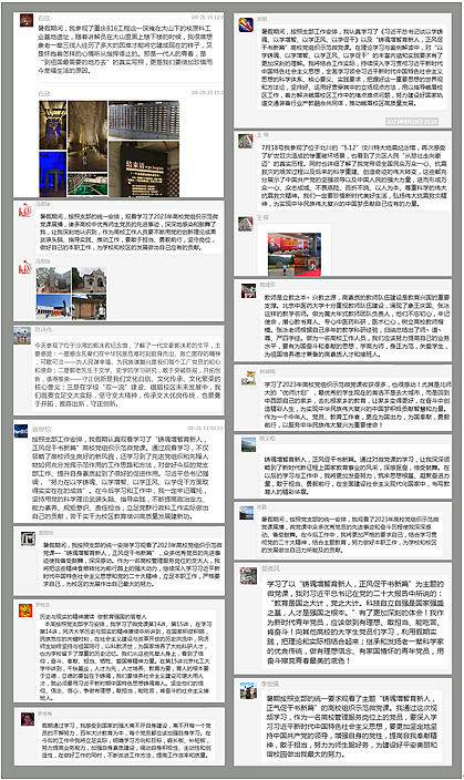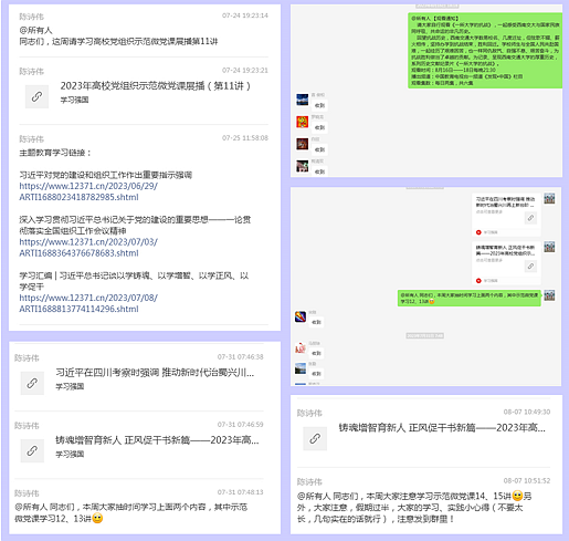 党支部号召全体党员,在假期里每周参加一次“铸魂增智育新人,正风促干书新篇”高校党组织示范微党课学习,每周通过学校专题网、以学习案例和学习资料两个栏目为重点进行一次学习,从一系列的新思想、新理论和微党课中汲取养分,不断滋养党性和思想,以学铸魂,以学增智,持续做到“学思想,强党性”。
