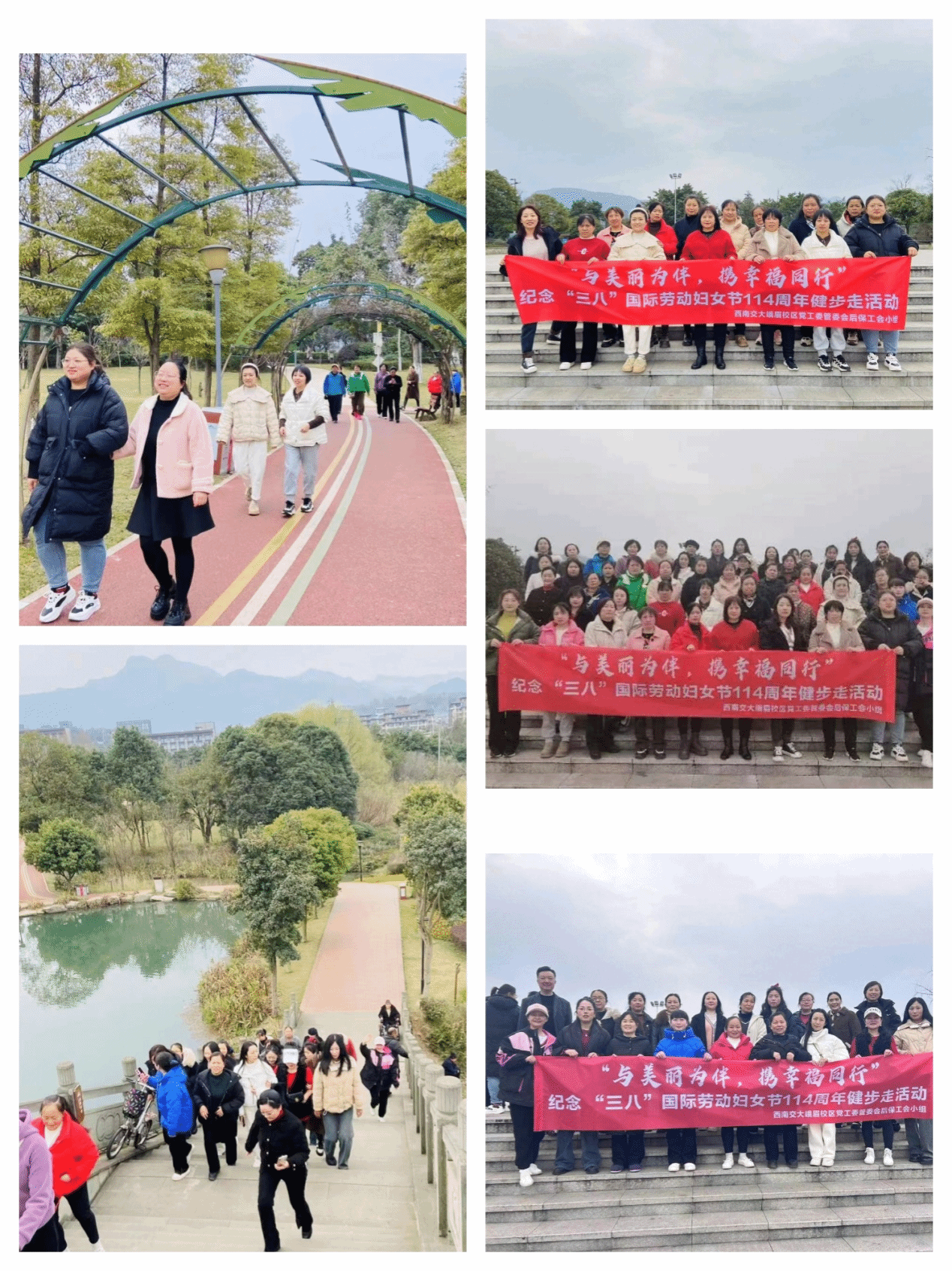 为迎接第114个“三八”国际劳动妇女节,进一步激发女职工不断提升素质,立足岗位建功立业的热情,调动女职工后勤保障服务工作的积极性、主动性和创造性,不断丰富女职工的业余文化生活,2024年3月7日,峨眉校区后保工会小组,组织全体女职工开展了“与美丽为伴,携幸福同行”“三八”节环湖健步走活动。