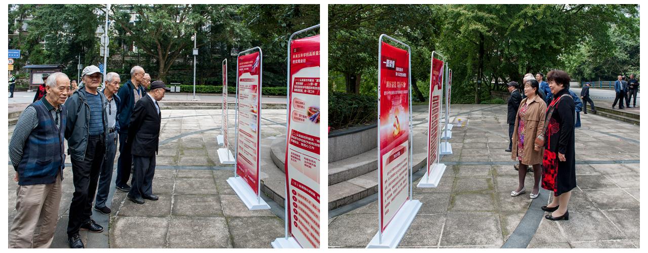 老同志们到达活动现场后,兴致盎然地在学校第十五次党代会精神宣传展架前围观学习,对学校发展取得的成绩赞不绝口,围绕学校未来的发展规划展开热烈讨论。