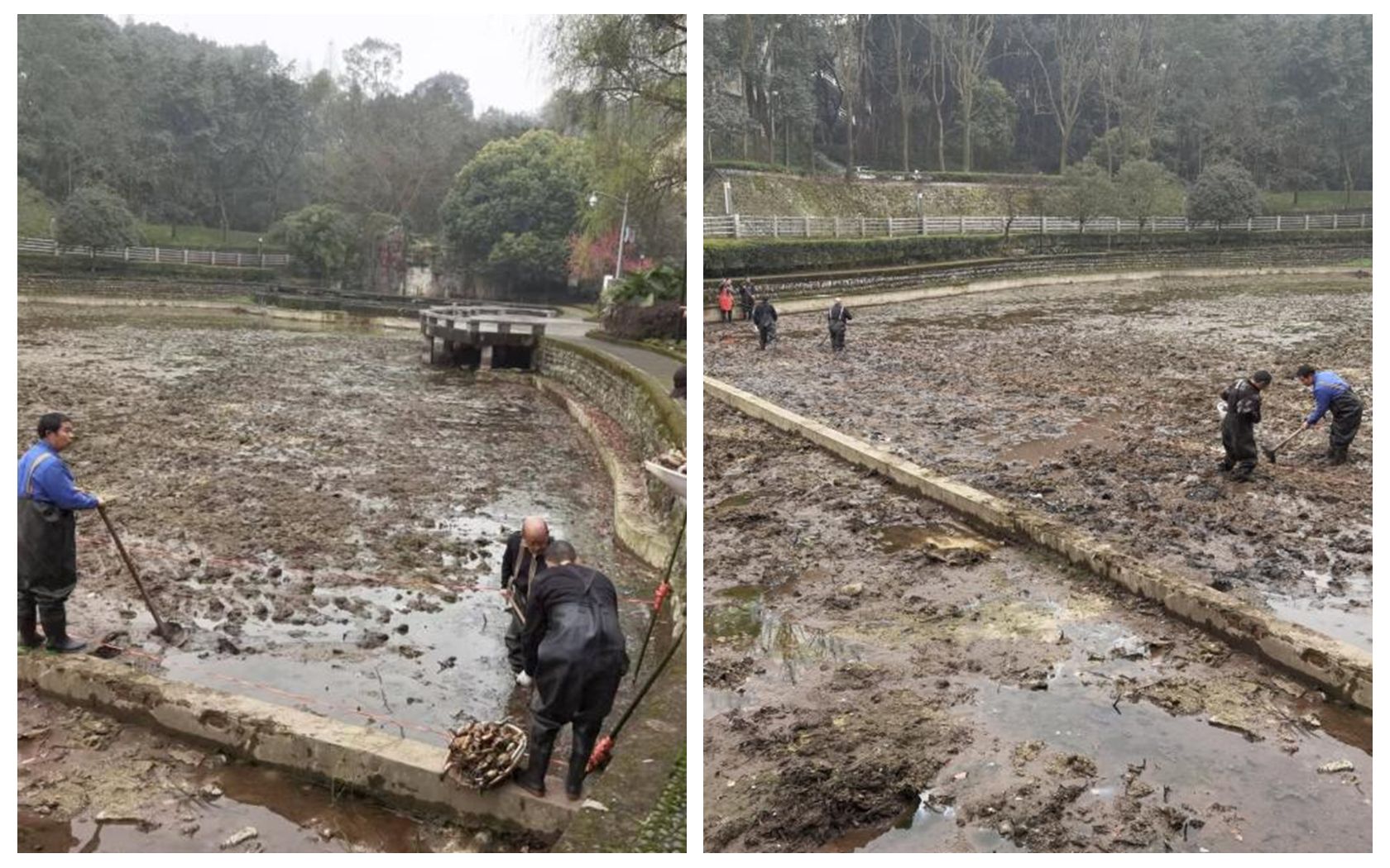 为再现明湖荷花盛开景观,园林工人栽植中。