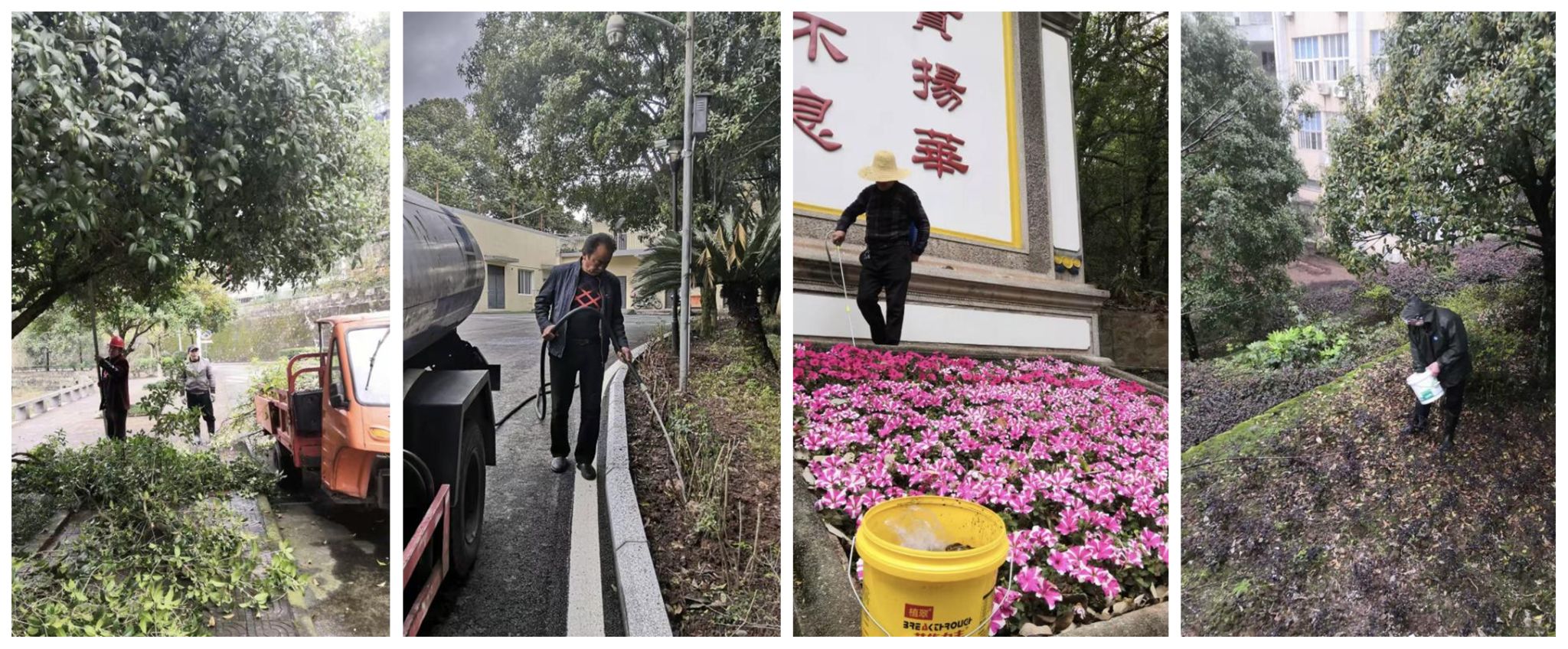 无论是春寒料峭的清晨,还是酷暑难耐的正午,园林工人们总是手持剪刀、水管与肥料,穿梭于校园的每一片绿意之中。他们用双手修剪枝叶,让绿树成荫、樱花如雪;他们蹲身除草,为草坪织就整齐的绿毯;他们调配药水,为树木驱虫防病,让每一株植物都焕发生机;他们的工作贯穿四季,以专业与匠心维护着校园的生态景观。