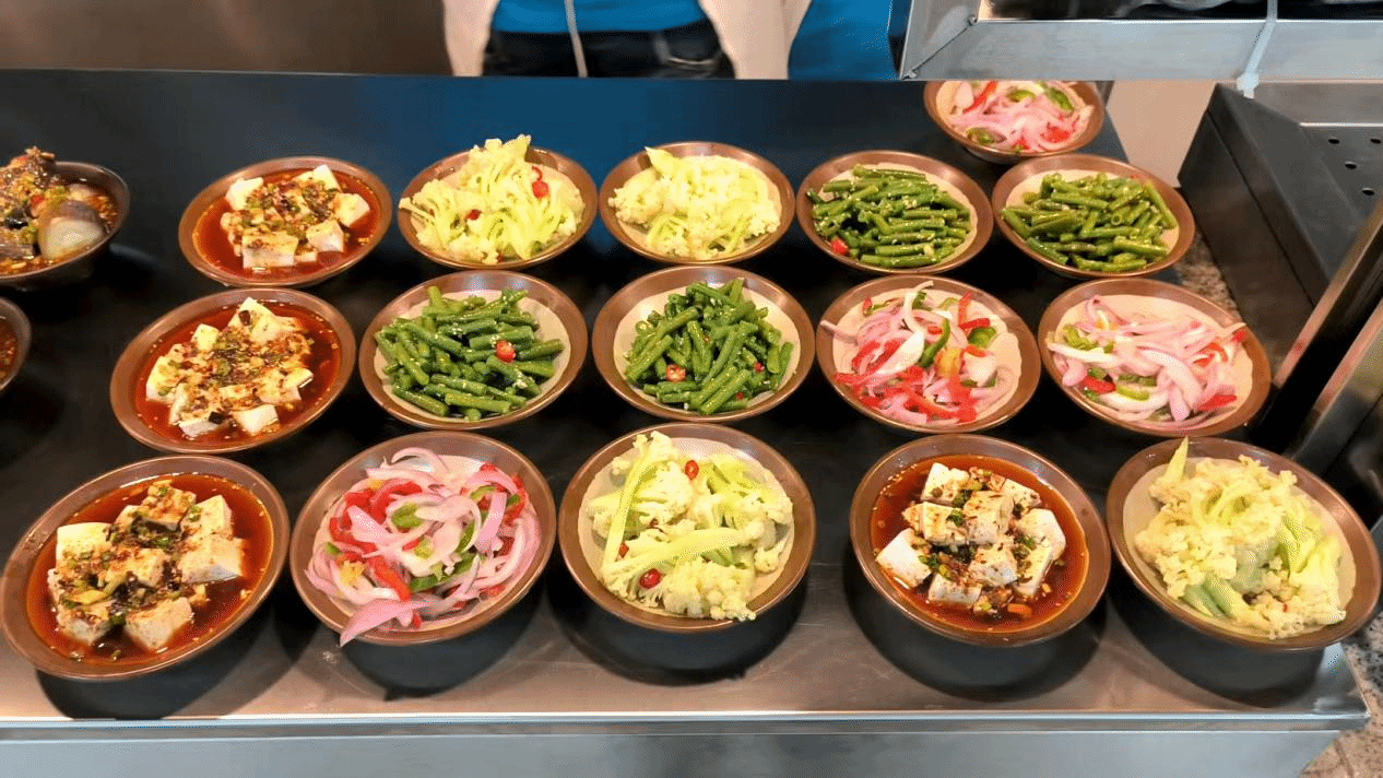 藤椒鸡、臊子蒸嫩蛋、蒜泥白肉、宫保鸡丁、豆豉鱼、风味茄子、素炒山药等佳肴每日焕新,荤素科学搭配,全力为师生带来丰富多样的用餐体验。