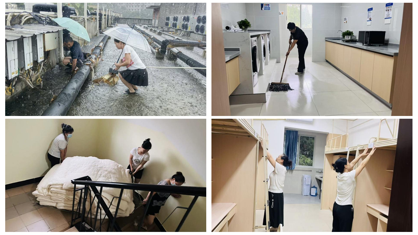 公寓守护,服务暖心 学生公寓员工并未因假期的到来而放松职责,他们坚守岗位全力以赴,顶着风雨及时处理楼顶排水口积叶、淤泥,完成培训入住铺床等各项服务工作,同时,扎实做好学生公寓迎新一系列准备工作。